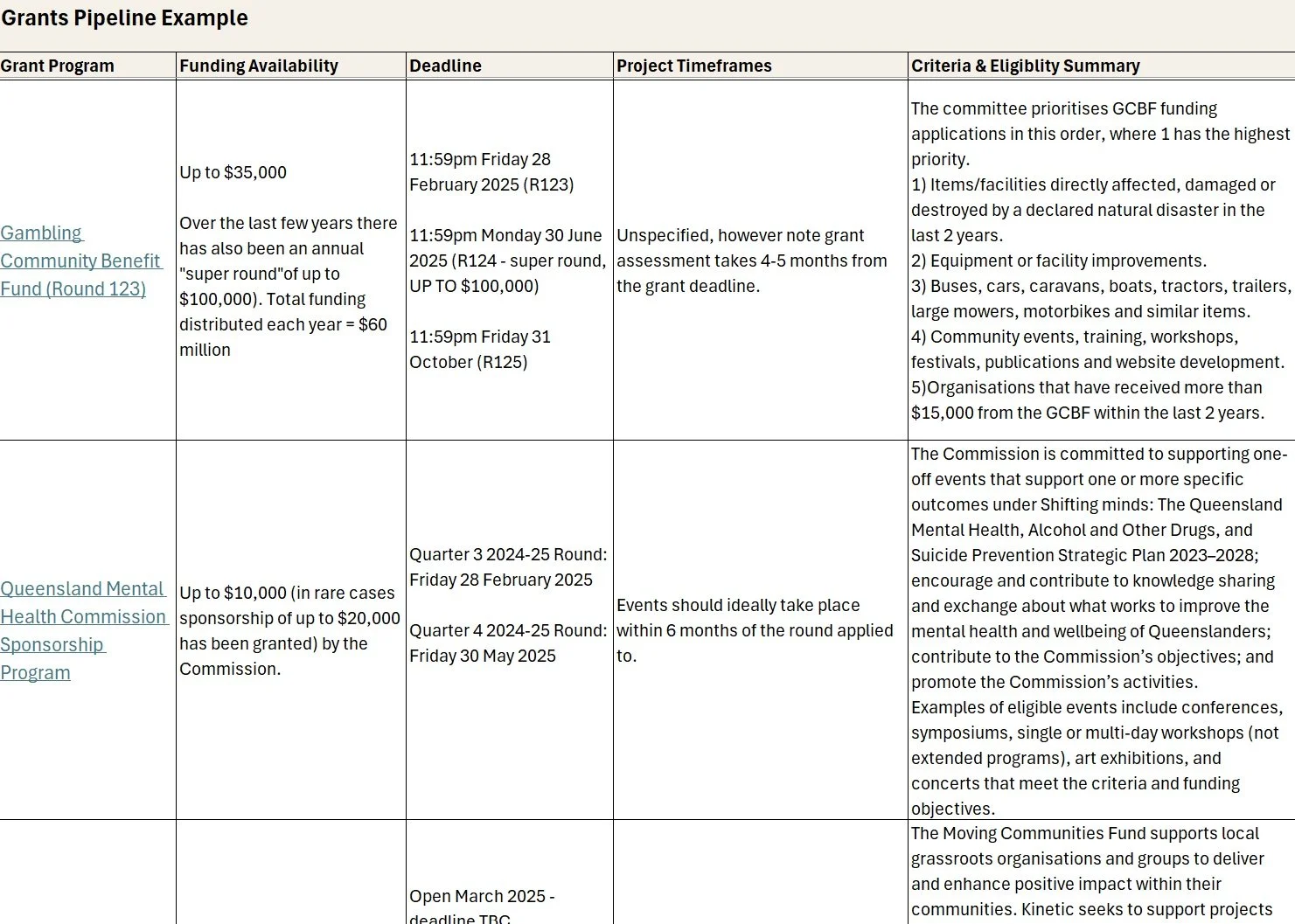 If this sounds like you, let Olivia strategically prepare your organisation for grant success by creating a tailored, chronological pipeline of current and forecast grant funding opportunities.